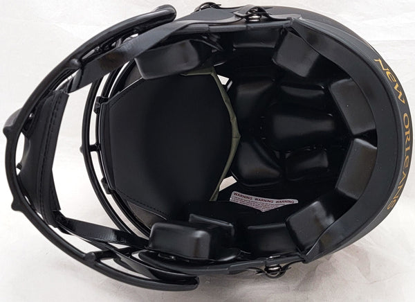 This is a New Orleans Saints Eclipse Black Full Size Authentic Speed Helmet that has been hand signed by Drew Brees. The Eclipse helmets are delicate and may have some marks or scratches on them. This item was inscribed "SB XLIV MVP." This item has been witnessed and certified authentic by Beckett Authentication (BAS) and comes with their tamper-proof witness sticker. Beckett Authentication has recently changed their physical certificate card policy where they no longer match their tamper-proof sticker with a physical certificate. A certificate can be printed on Beckett's website for the matching authentication number.