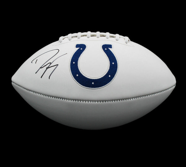 An Indianapolis Colts Embroidered White NFL Football hand signed by Dwight Freeney. The item and signature are in excellent condition. Dwight is a football defensive end. He was selected in round 1 of the 2002 drafts my the Indianapolis Colts were he spent the majority of his career. He is a SB Champ, 7x Pro Bowler, 3x Firts-Team All Pro, NFL Sacks leader and was on the NFL's 2000s All-Decade Team. AUTHENTICATION: The item is accompanied by a Certificate of Authenticity - Serial Numbered and Databased Hologram - Picture of Dwight from the signing