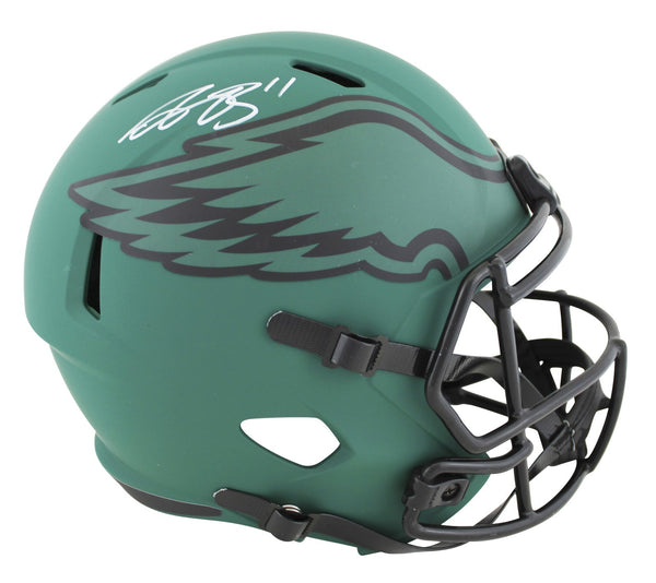 This Autographed Alternate Rave Riddell Full Size Speed Rep Helmet has been Personally Signed by A.J. Brown of the Philadelphia Eagles. This item is 100% Authentic to include a hologram by Beckett Authentication Services. This item will come with an affixed Beckett Authentication Services (BAS) authentication sticker, which includes a scannable QR code to verify authenticity. Please note that Beckett no longer provides serial-numbered COA cards, and the attached BAS sticker will serve as the complete authentication for this item. This is a BAS Witnessed Protection Program item which means a Beckett Authentication Service representative was present when this item was being signed. We conducted an autograph signing with A.J. Brown where multiples of the same item were signed. While the photographs are representative of this item, the size, placement and strength of the signature may vary. Each item is hand signed, therefore, each autograph is unique. This item can be verified through BAS Witnessed.