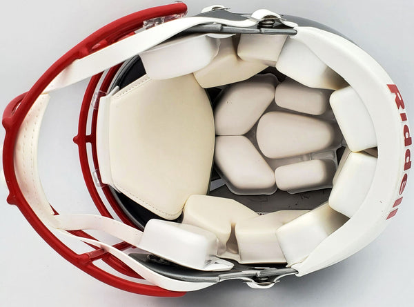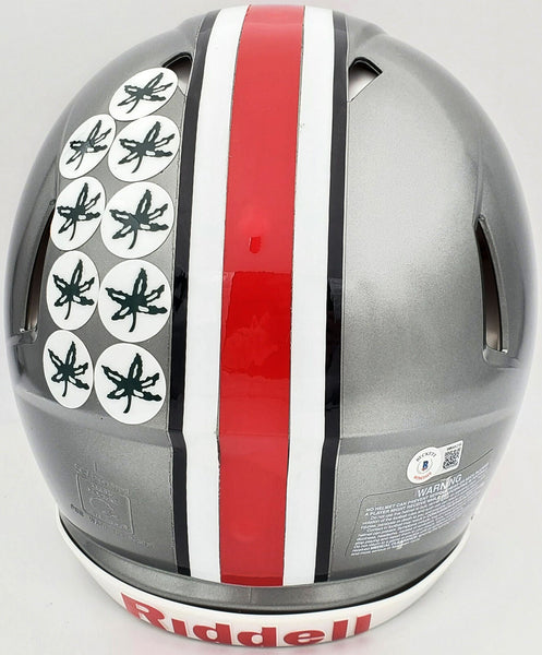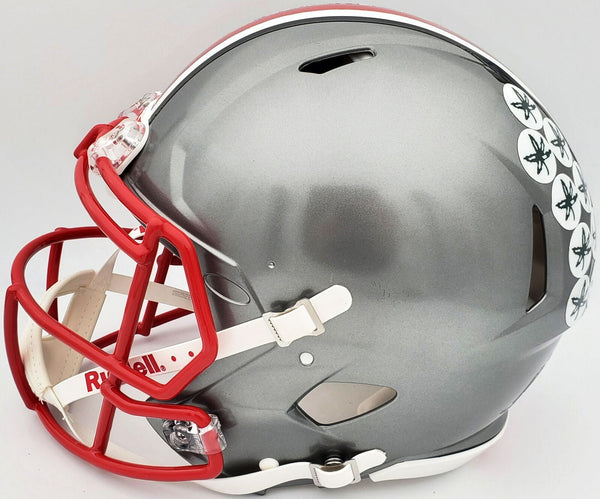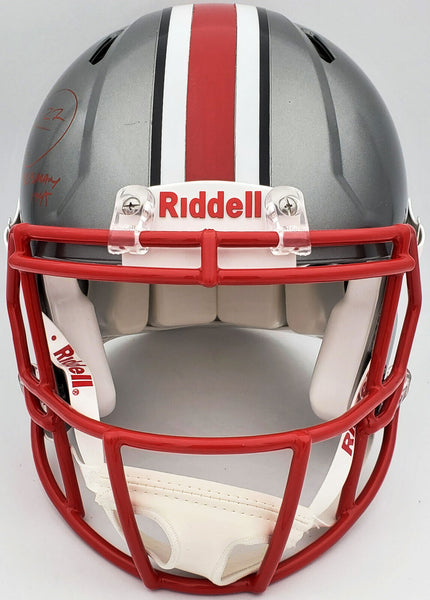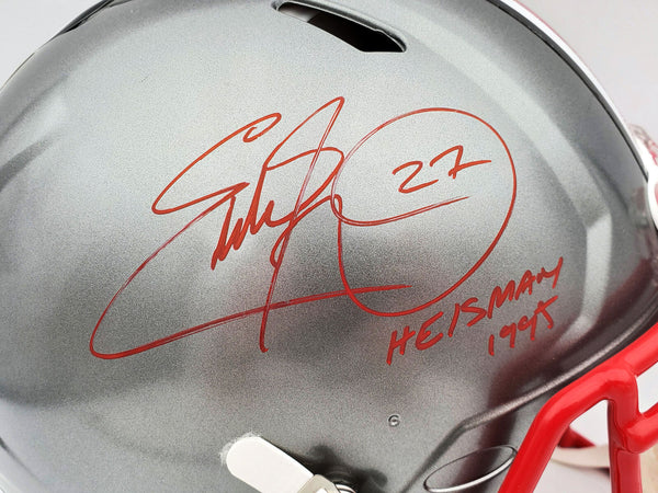 This is an Ohio State Buckeyes Flash Silver Full Size Authentic Speed Helmet that has been hand signed by Eddie George. The Flash helmets are very delicate and often have some marks or scratches on them. This item was inscribed "Heisman 1995." This item has been certified authentic by Beckett Authentication (BAS) and comes with their tamper-proof QR Code sticker that can be verified on the Beckett-authentication.com.