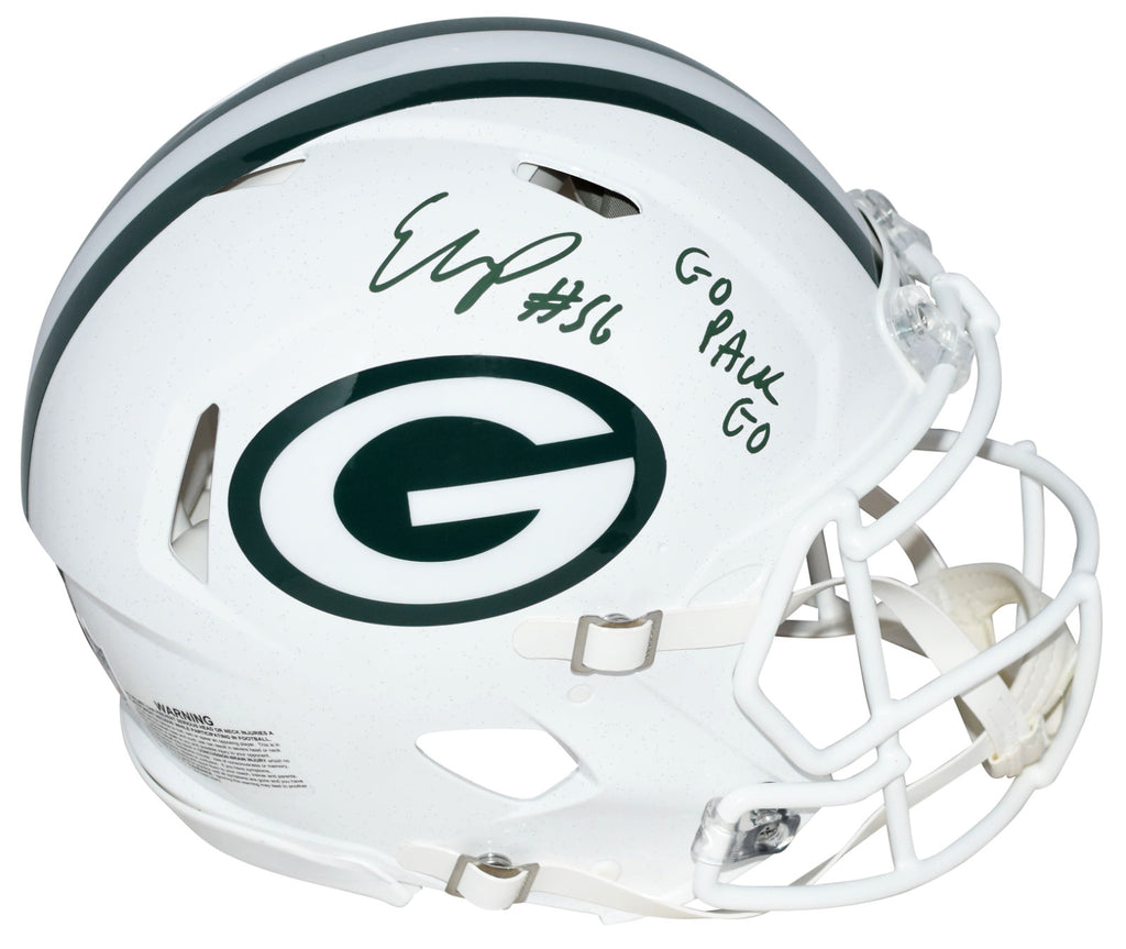 Edgerrin Cooper, star linebacker for the Green Bay Packers, has hand signed this Packers Riddell Speed full-size authentic helmet at a private signing. He included the inscription "Go Pack Go". This helmet is fully padded inside like the ones worn on the field. This item is authenticated by Beckett Authentication Services and was signed in the presence of one of their representatives. Their tamper-evident hologram featuring a QR code and serial number is on the item. The authenticity can be verified online by entering the serial number or scanning the QR code.Item pictured may not be the exact item you will receive. It will be similar quality, and we guarantee your satisfaction.