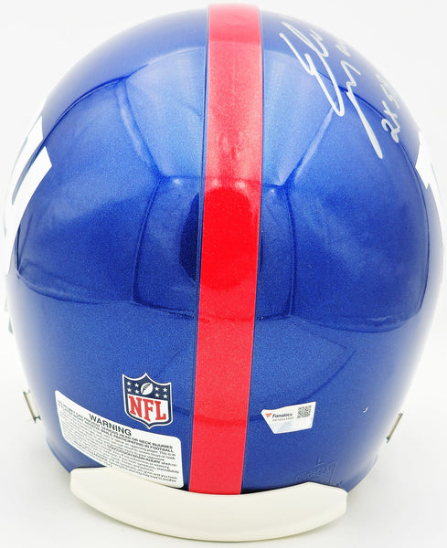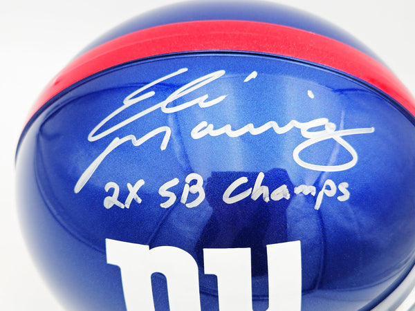 This is a New York Giants Blue Full Size VSR4 Authentic Helmet that has been hand signed by Eli Manning. This item was inscribed "2x SB Champs." This item has been certified authentic by Fanatics and comes with their tamper-proof sticker.