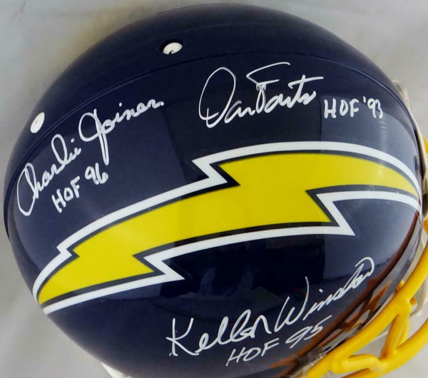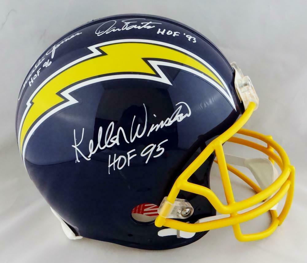 Fouts Joiner Winslow Autographed Chargers F/S Proline Helmet w/ HOF- Beckett W Auth *White This is a Hand Autographs of Dan Fouts, Charlie Joiner, and Kellen Winslow of the San Diego Chargers on a Riddell Football Full Size Proline Authentic 1974-1987 Throwback Helmet and inscribed with HOF. This item has a Beckett Witness Authentication, which comes with a Beckett numbered sticker and a matching Certificate of Authenticity. You can view this item on the Beckett Authentication website, it shows when and where the item was signed. It was signed either at a public autograph appearance or a private signing. This is a stock photo of the item. Although you may not receive this exact item, the item you receive is virtually identical and brand new in great shape.