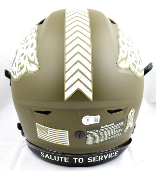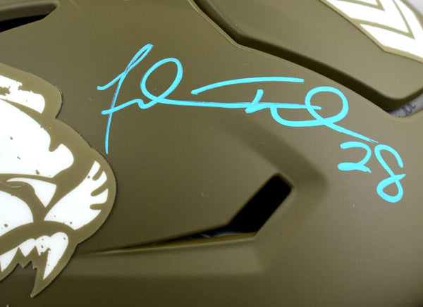 Fred Taylor Autographed Jaguars F/S Salute to Service Speed Flex Helmet- Beckett W Hologram *Teal This is a hand autograph of Fred Taylor of the Jacksonville Jaguars on a Riddell Football Full Size Salute to Service Speed Flex Authentic Helmet. This item has a Beckett Witnessed Authentication, which comes with a numbered hologram and a QR code for verification. You can view this item on the Beckett Authentication website. It was signed either at a public autograph appearance or a private signing. This is a stock photo of the item. Although you may not receive this exact item, the item you receive is virtually identical and brand new in great shape.