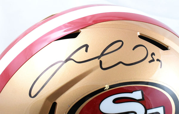 This is a Fred Warner of the San Francisco 49ers Autographed Riddell football full size Speed Replica helmet. This item has a Beckett Witnessed Authentication, which comes with a numbered hologram and a QR code for verification. You can view this item on the Beckett Authentication website and it shows when and where the item was signed. It was signed either at a public autograph appearance or a private signing. This is a stock photo of the item. Although you may not receive this exact item, the item you receive is virtually identical, brand new, and in great shape. *Autograph location may vary* This is a Fred Warner of the San Francisco 49ers Autographed Riddell football full size Speed Replica helmet. This item has a Beckett Witnessed Authentication, which comes with a numbered hologram and a QR code for verification. You can view this item on the Beckett Authentication website and it shows when and where the item was signed. It was signed either at a public autograph appearance or a private signing. This is a stock photo of the item. Although you may not receive this exact item, the item you receive is virtually identical, brand new, and in great shape. *Autograph location may vary*