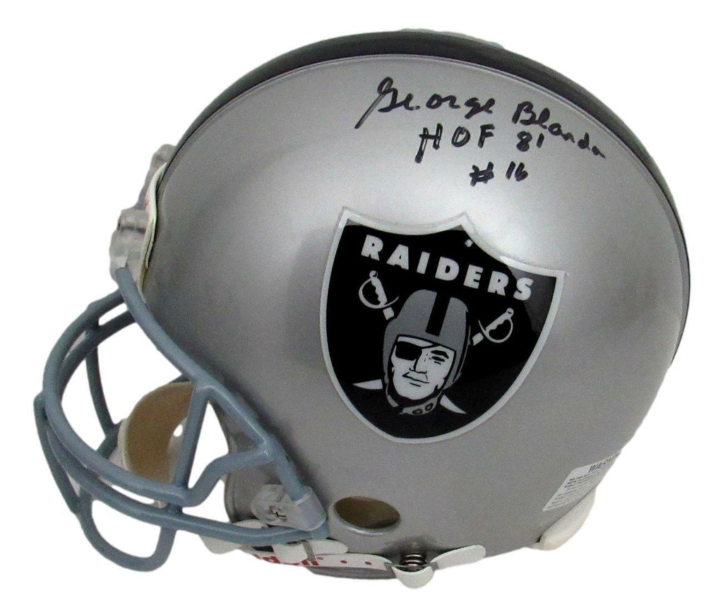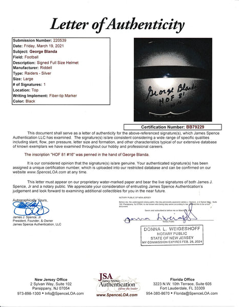 George Blanda Signed/Inscribed "HOF 81" Oakland Raiders Full Size Silver Riddell Authentic Football Helmet. This helmet is authenticated by JSA and includes their Tamper-proof Sticker and Letter of Authenticity.
