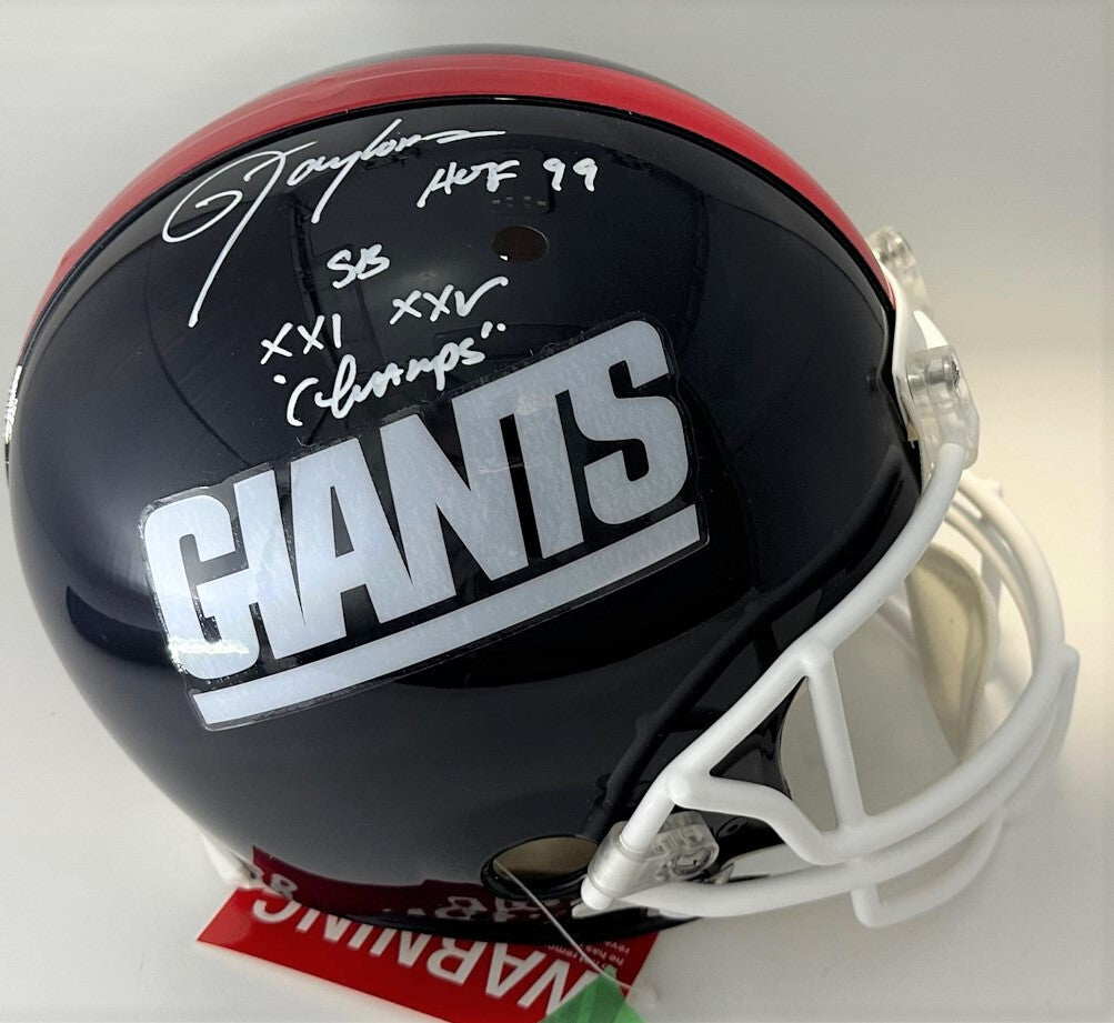 Riddell Full Size VSR4 Throwback Pro Line Authentic Helmet hand signed by New York Giants Hall of Famer LAWRENCE TAYLOR. The signature is in White paint pen with the inscriptions: HOF '99 & SB Champs". This item was signed at a private signing and would make a great addition to any GIANTS collection! This item is guaranteed to be 100% authentic and will include Beckett Authentication hologram.
