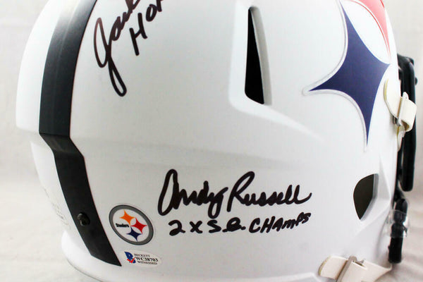 Ham Lambert Russell Autographed Pittsburgh Steelers F/S AMP Speed Helmet - Beckett W Auth *Black These are the hand autographs of Jack Ham, Jack Lambert and Andy Russell of the Pittsburgh Steelers on a Riddell Football Full Size AMP Speed Replica helmet. This item has been inscribed HOF 90 by Jack Lambert, HOF 88 for Jack Ham. This item has a James Spence Witness Protection Authentication, which comes with a numbered and a matching JSA Certificate of Authenticity. You can view this item on the SpenceLOA website and it shows when and where the item was signed. It was signed either at a public autograph appearance or a private signing. This is a stock photo of the item. Although you may not receive this exact item, the item you receive is virtually identical and brand new in great shape.
