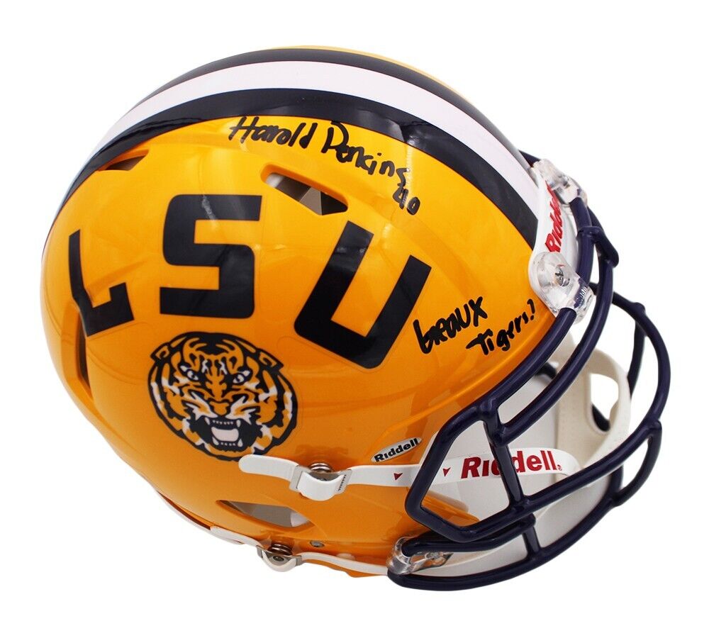 An LSU Tigers Speed Authentic Yellow NCAA Helmet hand signed by Herold Perkins. The item and signature are in excellent condition. In addition to signing his name, Harold also inscribed "Geaux Tigers" on the item. Harold is an outside linebacker for the LSU Tigers. AUTHENTICATION: Your item is tagged with a SmarTag powered by Prova Technology, which gives you digital access to your items authentication records, which includes a proof picture from the signing.