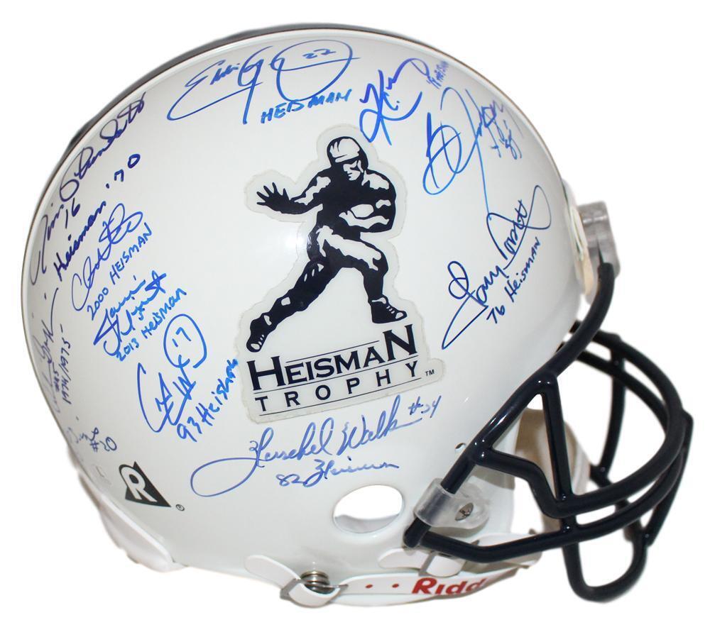 Heisman Trophy Winners Autographed/Signed Authentic Helmet 25 Sigs 24915 This is a Heisman Trophy full size authentic/proline helmet that was personally autographed by 25 Heisman trophy winners including: Hopalong Cassady, Tony Dorsett, Bo Jackson, Kyler Murray, Eddie George, Jim Plunkett, Chris Weinke, Jameis Winston, Charlie Ward, Herschel Walker, Archie Griffin, Billy Sims, Jason White, Billy Cannon, George Rogers, Mike Rozier, Eric Crouch, johnny Manziel, Paul Hornung, Johnny Rodgers, Gino Torretta, Charles White, Rashaan Salaam, Steve Owens and Dick Kazmaier. This is the exact helmet that you will recieve so please see scans for condition. This helmet includes a certificate of authenticity from Denver Autographs.