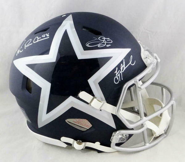 Irvin, Smith, Aikman Signed Dallas Cowboys F/S AMP Speed Authentic Helmet- Beckett Auth These are the hand autographs of Michael Irvin, Emmitt Smith, and Troy Aikman of the Dallas Cowboys on a Riddell Football Full Size AMP Speed Authentic Helmet. This item has a Beckett Authentication, which each comes with a Beckett numbered sticker and a matching Certificate of Authenticity. You can view this item on the Beckett Authentication website, it shows when and where the item was signed. It was signed either at a public autograph appearance or a private signing. This is a stock photo of the item. Although you may not receive this exact item, the item you receive is virtually identical and brand new in great shape.