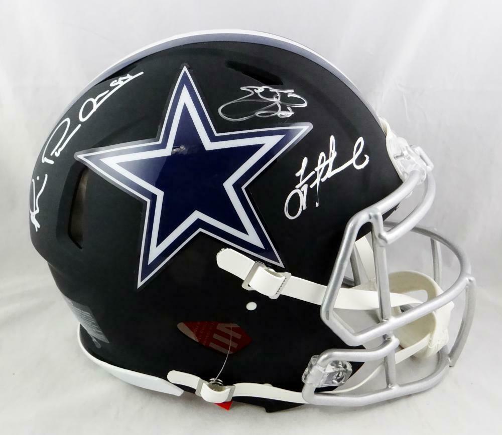 Irvin, Smith, Aikman Signed Dallas Cowboys F/S Flat Black Authentic Helmet- Beckett Auth These are the hand autographs of Michael Irvin, Emmitt Smith, and Troy Aikman of the Dallas Cowboys on a Riddell Football Full Size Flat Black Speed Authentic Helmet. This item has a Beckett Authentication, which each comes with a Beckett numbered sticker and a matching Certificate of Authenticity. You can view this item on the Beckett Authentication website, it shows when and where the item was signed. It was signed either at a public autograph appearance or a private signing. This is a stock photo of the item. Although you may not receive this exact item, the item you receive is virtually identical and brand new in great shape.
