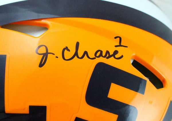 Ja'Marr Chase Autographed LSU Tigers F/S Speed Authentic Helmet-Beckett W Hologram *Black This is a Ja'Marr Chase of the LSU Tigers hand autographed Riddell Football Speed Full Size Authentic Helmet. This item has a Beckett Witnessed Authentication, which comes with a numbered sticker hologram and a QR code for verification. You can view this item on the Beckett website and it shows when and where the item was signed. It was signed either at a public autograph appearance or a private signing. This is a stock photo of the item. Although you may not receive this exact item, the item you receive is virtually identical, brand new, and in great shape.