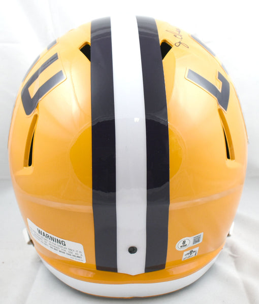 This is a hand autograph of Ja' Marr Chase of the LSU Tigers on a Riddell Football Full Size Speed Replica Helmet. This item has a Beckett Witness Authentication, which comes with a numbered hologram and a QR code for verification. You can view this item on the Beckett Authentication website and it shows when and where the item was signed. It was signed either at a public autograph appearance or a private signing. This is a stock photo of the item. Although you may not receive this exact item, the item you receive is virtually identical and brand new in great shape. This is a hand autograph of Ja' Marr Chase of the LSU Tigers on a Riddell Football Full Size Replica Helmet. This item has a Beckett Witness Authentication, which comes with a numbered hologram and a QR code for verification. You can view this item on the Beckett Authentication website and it shows when and where the item was signed. It was signed either at a public autograph appearance or a private signing. This is a stock photo of the item. Although you may not receive this exact item, the item you receive is virtually identical and brand new in great shape.