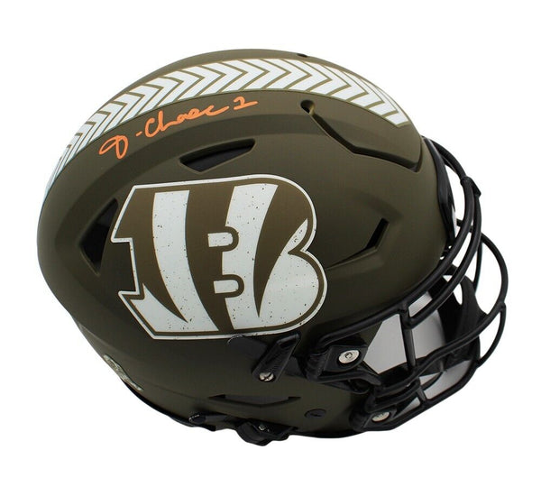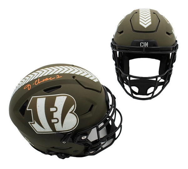 A Cincinnati Bengals Speed Flex Authentic Salute to Service NFL Helmet hand signed by Ja'Marr Chase. The item and signature are in excellent condition. Ja'Marr is a Football wide receiver. He was selected in the 1st round of the 2021 NFL Draft by the Cincinnati Bengals. He played college football at LSU. AUTHENTICATION: The item is accompanied by a Beckett Serial Numbered and Databased Hologram