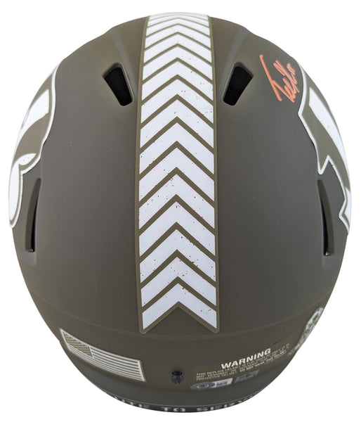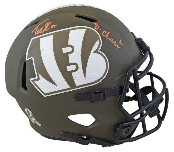 This Autographed Alternate Salute To Service Riddell Full Size Speed Rep Helmet has been Personally Signed by Ja'Marr Chase & Tee Higgins of the Cincinnati Bengals. This item is 100% Authentic to include a hologram by Beckett Authentication Services. This item will come with an affixed Beckett Authentication Services (BAS) authentication sticker, which includes a scannable QR code to verify authenticity. Please note that Beckett no longer provides serial-numbered COA cards, and the attached BAS sticker will serve as the complete authentication for this item. This is a BAS Witnessed Protection Program item which means a Beckett Authentication Service representative was present when this item was being signed. We conducted an autograph signing with Ja'Marr Chase & Tee Higgins where multiples of the same item were signed. While the photographs are representative of this item, the size, placement and strength of the signature may vary. Each item is hand signed, therefore, each autograph is unique. This item can be verified through BAS Witnessed.