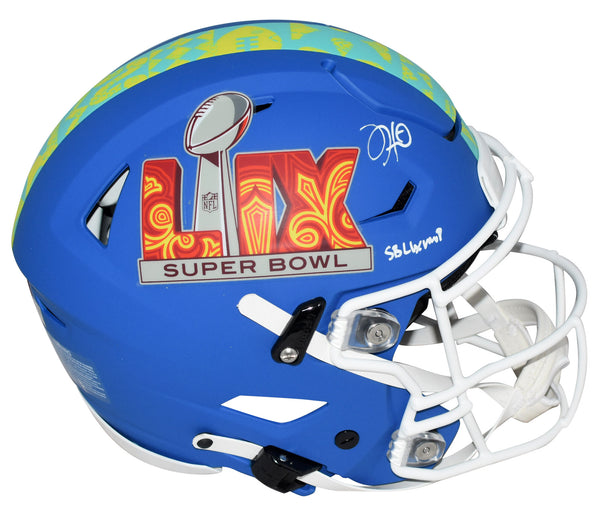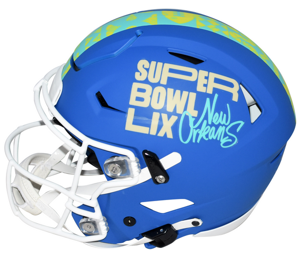 Jalen Hurts, star quarterback for the Philadelphia Eagles, has hand signed this Super Bowl LIX Riddell SpeedFlex full-size authentic helmet at a private signing. He included the inscription "SB LIX MVP" with his signature. This helmet is fully padded inside like the ones worn on the field. This item comes with a serial-numbered hologram from Fanatics Authentic, one of the leaders in the industry. The authenticity can be verified online by entering the serial-number. A Fanatics Authentic information card is also included.Item pictured may not be the exact item you will receive. It will be similar quality, and we guarantee your satisfaction.