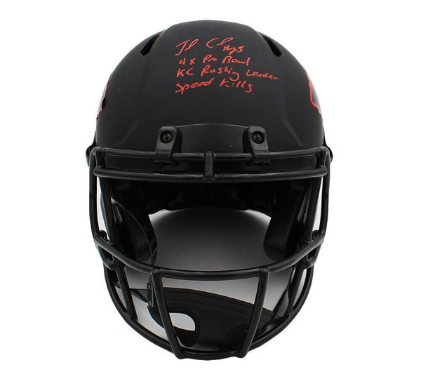 A Kansas City Chiefs Speed Authentic Custom NFL Helmet hand signed by Jamaal Charles. The item and signature are in excellent condition. In addition to signing his name, Jamaal also inscribed "4x Pro Bowl", "KC Rushing Leader", and "Speed kills" on the item. Jamaal Charles is a former professional football player, widely regarded as one of the most dynamic running backs in NFL history. Charles played college football at the University of Texas before being drafted by the Kansas City Chiefs in the third round of the 2008 NFL Draft. Charles became the Chiefs' all-time leading rusher and earned multiple Pro Bowl selections. Charles retired in 2017, finishing his career with over 7,500 rushing yards and 44 touchdowns. AUTHENTICATION: The item is accompanied by a Beckett Certificate of Authenticity and a Beckett Authentic Serial Numbered and Databased Hologram