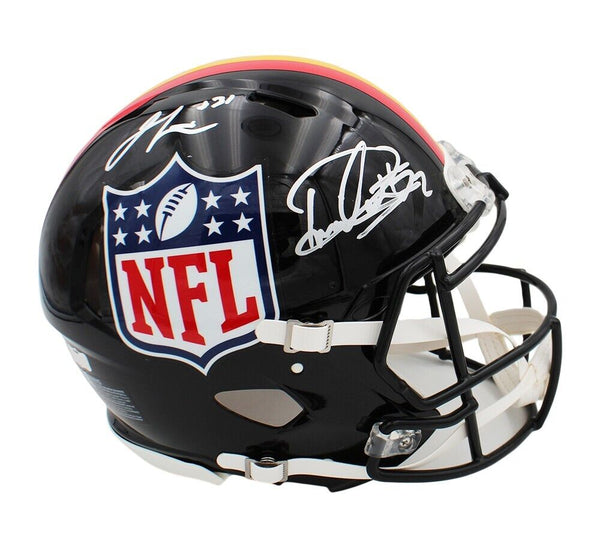 A Speed Black NFL Shield Helmet hand signed by Jamal Lewis and Derrick Henry. The item and signature are in excellent condition. Jamal Lewis is a football running back. He played college football for the Tennessee Volunteers before being drafted by the Baltimore Ravens in the 1st round, 5th overall, in the 2000 NFL Draft. He is a Super Bowl Champ. In 2003 he was selected for the Pro Bowl, First Team All-Pro, NFL Offensive Player of the year and NFL Rushing Yards Leader of the year. Derrick is an NFL running back for the Tennessee Titans. He was drafted by the Titans in the second round of the 2016 NFL Draft. He played in college for the Alabama Crimson Tide. He is a 2019 Pro Bowler, 2019 Second-team All-Pro, 2019 NFL rushing yards leader, and the 2015 Heisman Trophy recipient. AUTHENTICATION: The item is accompanied by a Certificate of Authenticity - Serial Numbered and Databased Hologram - Picture of Jamal from the Signing