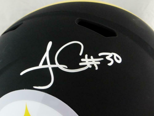 James Conner Autographed Pittsburgh Steelers F/S Flat Black Helmet- Beckett Auth *Silver This is a Hand Autograph of James Conner of the Pittsburgh Steelers on a Riddell Football Full Size Flat Black Replica Helmet. This item has a Beckett Authentication, which comes with a Beckett #'ed and a matching certificate of authenticity. You can view this item on the Beckett website. It was signed either at a public autograph appearance or a private signing. This is a stock photo of the item. Although you may not receive this exact item, the item you receive is virtually identical and brand new in great shape.