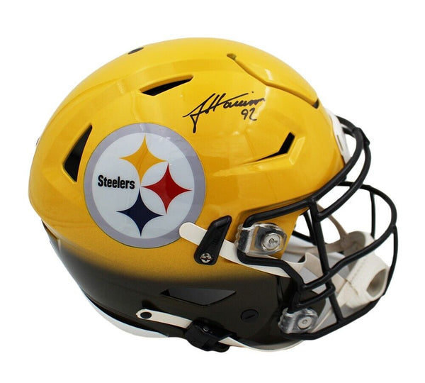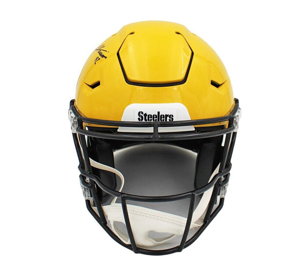 A Pittsburgh Steelers Custom Speed Flex Authentic Yellow NFL Helmet Hand Signed by James Harrison. The item and signature are in excellent condition. James is a former linebacker. He played college football for Kent State University and was signed by the Pittsburgh Steelers as an undrafted free agent in 2002. A five-time Pro Bowl selection, Harrison won two Super Bowls with the Steelers: XL and XLIII. In 2008, he became the only undrafted player to be named Associated Press NFL Defensive Player of the Year. AUTHENTICATION: The item is accompanied by a Certificate of Authenticity - Serial Numbered and Databased Hologram
