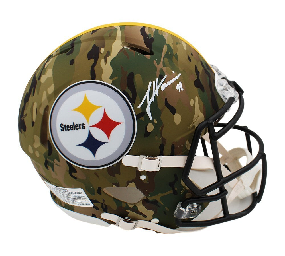 A Pittsburgh Steelers Speed Authentic Camo NFL Helmet hand signed by James Harrison. The item and signature are in excellent condition. James is a former linebacker. He played college football for Kent State University and was signed by the Pittsburgh Steelers as an undrafted free agent in 2002. A five-time Pro Bowl selection, Harrison won two Super Bowls with the Steelers: XL and XLIII. In 2008, he became the only undrafted player to be named Associated Press NFL Defensive Player of the Year. AUTHENTICATION: The item has been tagged with a SmarTag powered by Prova Technology, which gives you digital access to the items authentication records, including a proof picture from the signing.