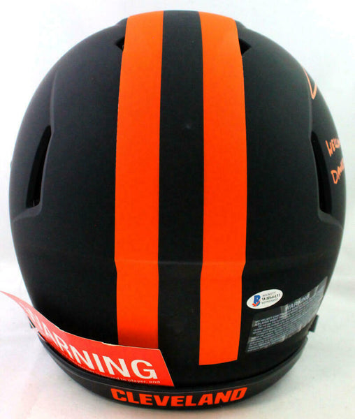 Jarvis Landry Signed Browns FS Eclipse Speed Authentic Helmet W/ Insc-Beckett W *Orange This is a hand autographed Jarvis Landry of the Cleveland Browns Riddell Football Full Size Eclipse Speed Authentic Helmet inscribed with "Welcome To The Dog Pound!". This item has a Beckett Witnessed Protection Authentication, which comes with a numbered and a matching Certificate of Authenticity. You can view this item on the Beckett website and it shows when and where the item was signed. It was signed either at a public autograph appearance or a private signing. This is a stock photo of the item. Although you may not receive this exact item, the item you receive is virtually identical, brand new, and in great shape.