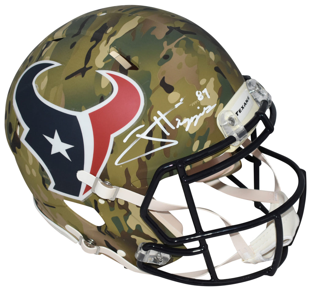 Jayden Higgins, star wide receiver for the Houston Texans, has hand signed this Texans Riddell Speed Camo full-size authentic helmet at a private signing. This helmet is fully padded inside like the ones worn on the field. This item is authenticated by Beckett Authentication Services and was signed in the presence of one of their representatives. Their tamper-evident hologram featuring a QR code and serial number is on the item. The authenticity can be verified online by entering the serial number or scanning the QR code.Item pictured may not be the exact item you will receive. It will be similar quality, and we guarantee your satisfaction.