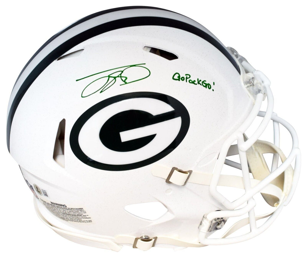 Jayden Reed, star wide receiver for the Green Bay Packers, has hand signed this Packers Riddell Speed full-size authentic helmet at a private signing. He included the inscription "Go Pack Go". This helmet is fully padded inside like the ones worn on the field. This item is authenticated by Beckett Authentication Services and was signed in the presence of one of their representatives. Their tamper-evident hologram featuring a QR code and serial number is on the item. The authenticity can be verified online by entering the serial number or scanning the QR code.Item pictured may not be the exact item you will receive. It will be similar quality, and we guarantee your satisfaction.