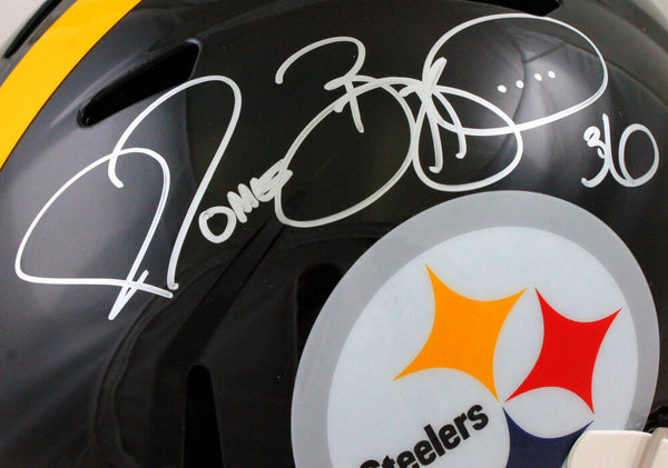 This is a hand autograph of Jerome Bettis of the Pittsburgh Steelers on a Riddell Football Full Size Speed Replica Helmet. This item has a Beckett Witness Authentication, which comes with a numbered hologram and a QR code for verification. You can view this item on the Beckett Authentication website and it shows when and where the item was signed. It was signed either at a public autograph appearance or a private signing. This is a stock photo of the item. Although you may not receive this exact item, the item you receive is virtually identical and brand new in great shape. This is a hand autograph of Jerome Bettis of the Pittsburgh Steelers on a Riddell Football Full Size Speed Replica Helmet. This item has a Beckett Witness Authentication, which comes with a numbered hologram and a QR code for verification. You can view this item on the Beckett Authentication website and it shows when and where the item was signed. It was signed either at a public autograph appearance or a private signing. This is a stock photo of the item. Although you may not receive this exact item, the item you receive is virtually identical and brand new in great shape.