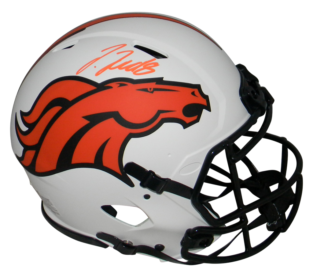 Jerry Jeudy, wide receiver for the Denver Broncos, has hand signed this Broncos Riddell Speed Lunar full-size authentic helmet at a private signing. This helmet is fully padded inside like the ones worn on the field. This item comes with a certificate of authenticity (COA) from Beckett Authentication Services and was signed in the presence of one of their representatives. You will receive a serial-numbered COA along with a matching serial-numbered sticker on the helmet. The authenticity can be verified online by entering the serial number.Item pictured may not be the exact item you will receive. It will be similar quality, and we guarantee your satisfaction.