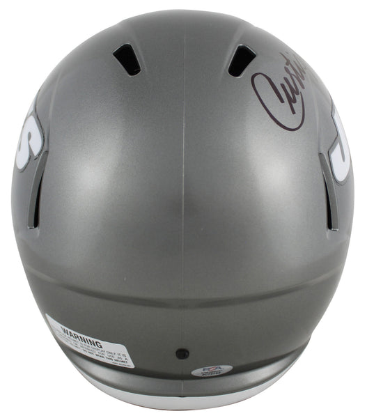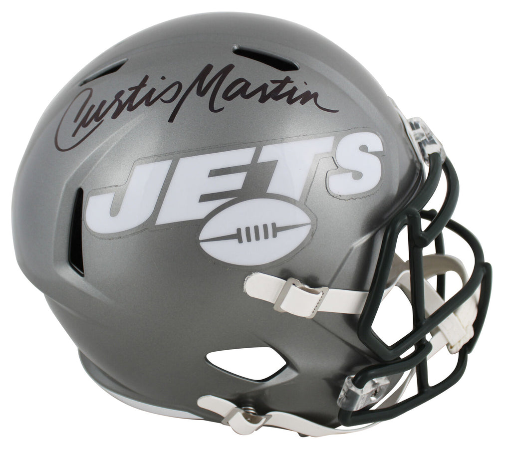This Autographed Alternate Flash Riddell Full Size Speed Rep Helmet has been Personally Signed by Curtis Martin of the New York Jets. This item is 100% Authentic and comes with a PSA/DNA Certification Card and a matching numbered Hologram. This is a PSA in the Presence Authenticated item which means a PSA representative was present when this item was being signed. We conducted an autograph signing with Curtis Martin where multiples of the same item were signed. While the photographs are representative of this item, the size, placement and strength of the signature may vary. Each item is hand signed, therefore, each autograph is unique. This item can be verified through PSA/DNA Itp.