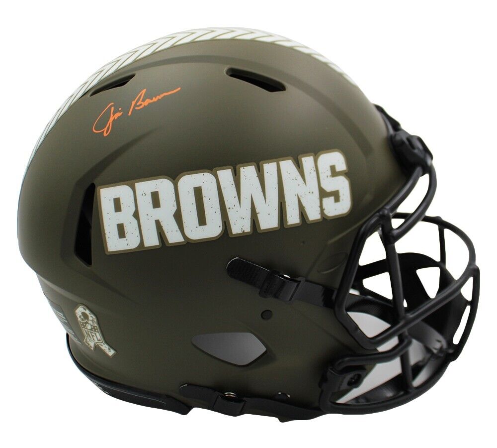 A Cleveland Browns Speed Authentic Salute to Service NFL Helmet with Orange Ink hand signed by Jim Brown. The item and signature are in excellent condition. Jim is an 8x Pro Bowler, 4x NFL MVP and an NFL Champion. AUTHENTICATION: Your item is tagged with a SmarTag powered by Prova Technology, which gives you digital access to your items authentication records, which includes a proof picture from the signing.