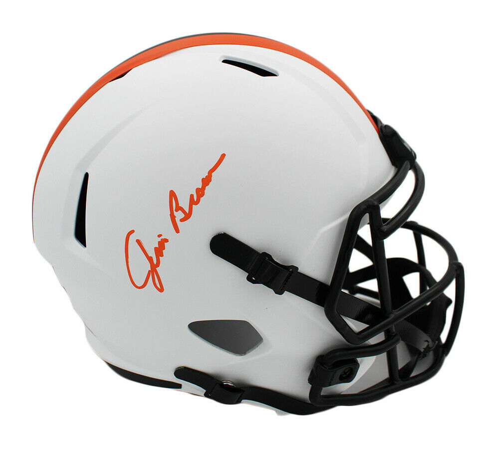 A Cleveland Browns Speed Replica Lunar NFL Helmet hand signed by Jim Brown. The item and signature are in excellent condition. Jim is an 8x Pro Bowler, 4x NFL MVP and an NFL Champion. AUTHENTICATION: The item is accompanied by a Certificate of Authenticity - Serial Numbered and Databased Hologram - Picture of Jim from the signing