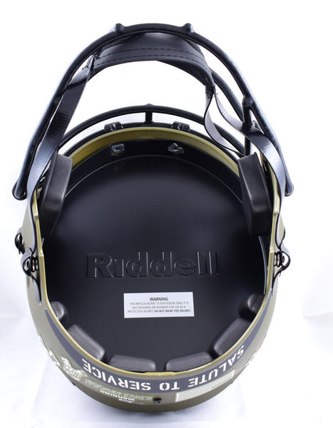 Jim Kelly Autographed Buffalo Bills F/S Salute to Service Speed Helmet-Beckett W Hologram *White This is a hand autograph of Jim Kelly of the Buffalo Bills on a Riddell Football Full Size Salute to Service Speed Replica Helmet. This item has a Beckett Witness Authentication, which comes with a Beckett numbered hologram and a QR code for verification. You can view this item on the Beckett website and it shows when and where the item was signed. It was signed either at a public autograph appearance or a private signing. This is a stock photo of the item. Although you may not receive this exact item, the item you receive is virtually identical and brand new in great shape.