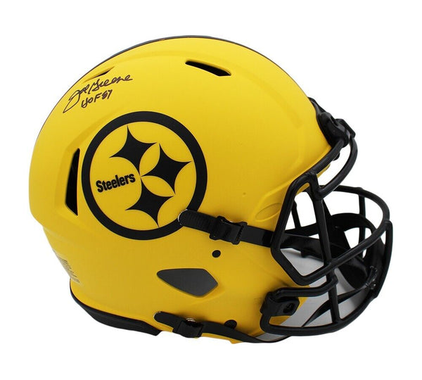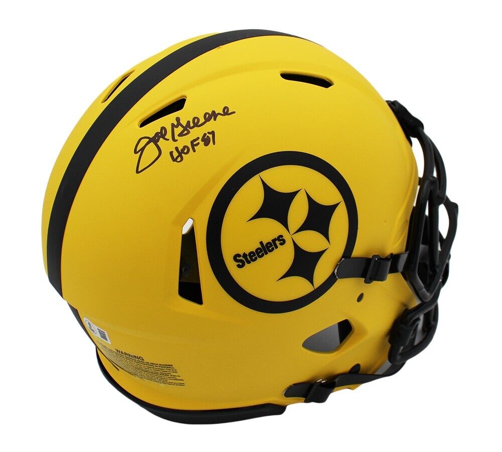 A Pittsburgh Steelers Speed Authentic Rave NFL Helmet hand signed by Joe Greene. The item and signature are in excellent condition. In addition to signing his name Joe also inscribed "HOF 87" on the item. AUTHENTICATION: The item is accompanied by a Beckett Serial Numbered and Databased Hologram.