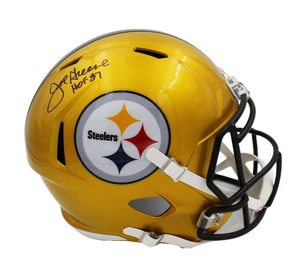 A Pittsburgh Steelers Speed Replica Flash NFL Helmet hand signed by Joe Greene. The item and signature are in excellent condition. In addition to signing his name Joe also inscribed "HOF 87" on the item. AUTHENTICATION: The item is accompanied by a Schwartz Sports Certificate of Authenticity - Schwartz Sports Serial Numbered and Databased Hologram