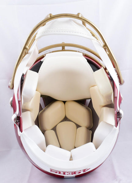 Joe Montana Autographed San Francisco 49ers F/S Flash Speed Authentic Helmet - Fanatics *Gold This is a hand autograph of Joe Montana of the San Francisco 49ers on a Riddell Football Full Size Flash Speed Authentic Helmet. This item has a Fanatics Authentication, which comes with a numbered sticker hologram and a QR code for verification. You can view this item on the Fanatics Authentication website and it shows the item was signed. It was signed either at a public autograph appearance or a private signing. This is a stock photo of the item. Although you may not receive this exact item, the item you receive is virtually identical and brand new in great shape.