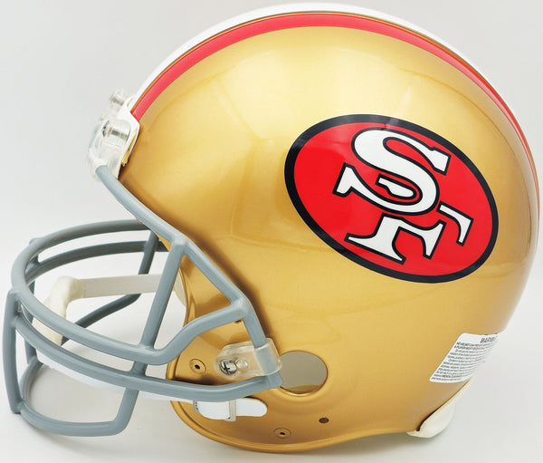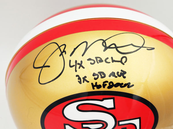 This is a San Francisco 49ers Gold Full Size Speed Authentic Helmet that has been hand signed by Joe Montana. This item was inscribed "4X SB Champ, 3X SB MVP, HOF 2000." This item has been witnessed and certified authentic by Beckett Authentication (BAS) and comes with their tamper-proof witness sticker.
