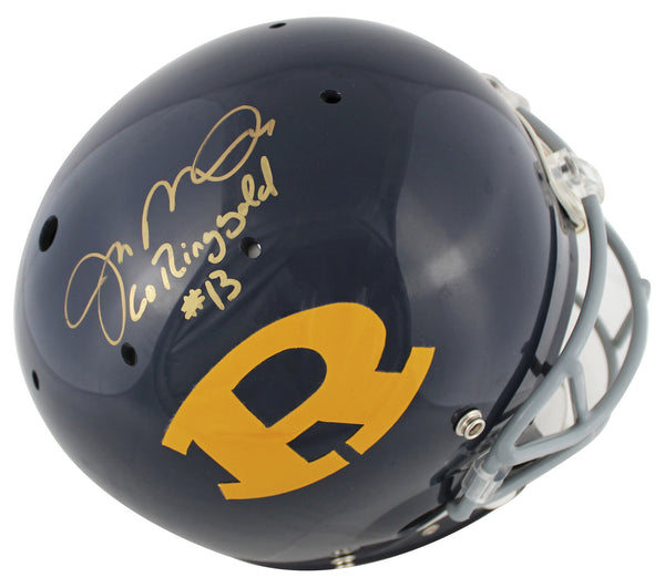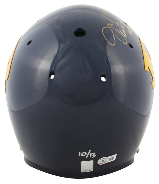 This Autographed Limited Edition #10/13 Ringgold High School Authentic Full Size Proline Helmet with the inscription of "Go Ringgold #13" has been Personally Signed by Joe Montana. This item is 100% Authentic to include a hologram by Beckett Authentication Services. This item will come with an affixed Beckett Authentication Services (BAS) authentication sticker, which includes a scannable QR code to verify authenticity. Please note that Beckett no longer provides serial-numbered COA cards, and the attached BAS sticker will serve as the complete authentication for this item. The authenticity can be verified on Beckett Authentication Services website.
