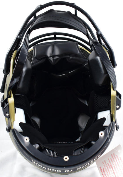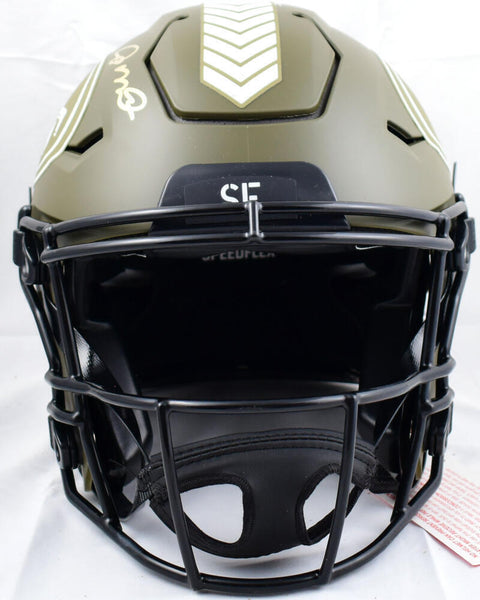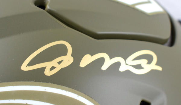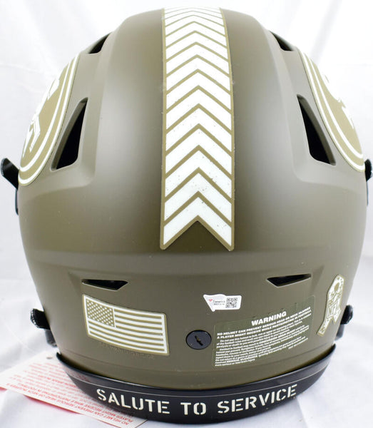 Joe Montana Autographed San Francisco 49ers F/S Salute to Service Speed Flex Helmet- Fanatics *Gold This is a hand autograph of Joe Montana of the San Francisco 49ers on a Full Size Salute to Service Speed Flex Authentic Helmet. This item has a Fanatics Authentication, which comes with a Fanatics numbered sticker hologram and a QR code for verification. You can view this item on the Beckett Authentication website. It was signed either at a public autograph appearance or a private signing. This is a stock photo of the item. Although you may not receive this exact item, the item you receive is virtually identical and brand new in great shape.