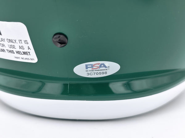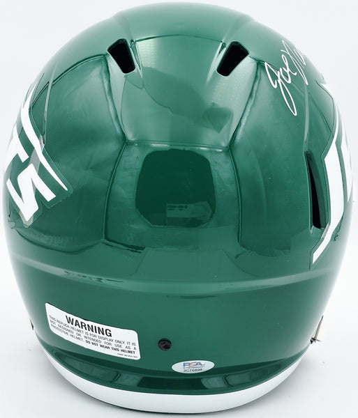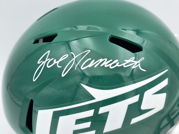 This is a New York Jets 1978-89 Throwback Green Full Size Speed Replica Helmet that has been hand signed by Joe Namath. This item has been witnessed and certified authentic by PSA/DNA ITP and comes with their tamper-proof hologram.