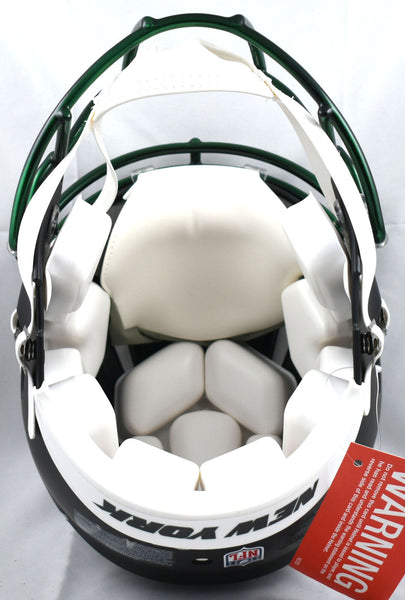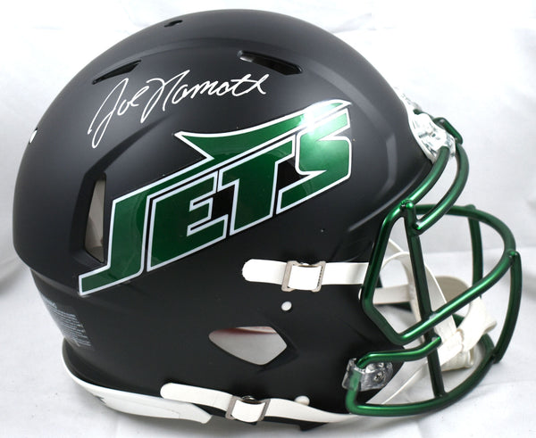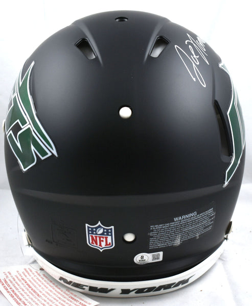 This is a Joe Namath of the New York Jets Autographed Riddell football full size Black Alternate Speed Authentic helmet. This item has a Beckett Witnessed Authentication, which comes with a numbered sticker hologram and a QR code for verification. You can view this item on the Beckett Authentication website and it shows when and where the item was signed. It was signed either at a public autograph appearance or a private signing. This is a stock photo of the item. Although you may not receive this exact item, the item you receive is virtually identical, brand new, and in great shape. This is a Joe Namath of the New York Jets hand autographed Riddell football full size Black Alternate Speed Authentic helmet. This item has a Beckett Witnessed Authentication, which comes with a numbered sticker hologram and a QR code for verification. You can view this item on the Beckett Authentication website and it shows when and where the item was signed. It was signed either at a public autograph appearance or a private signing. This is a stock photo of the item. Although you may not receive this exact item, the item you receive is virtually identical, brand new, and in great shape.