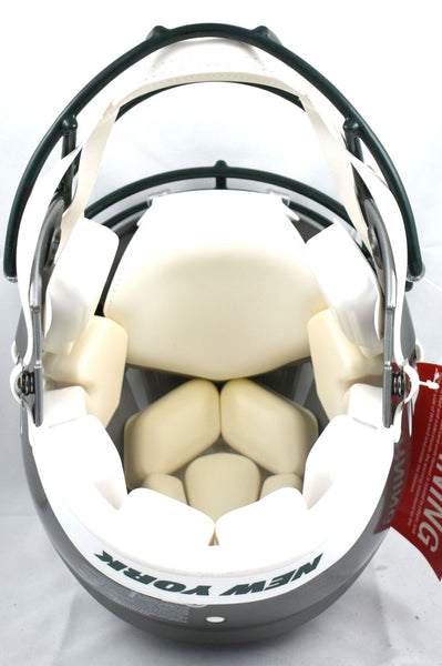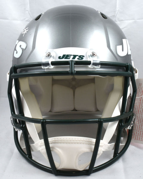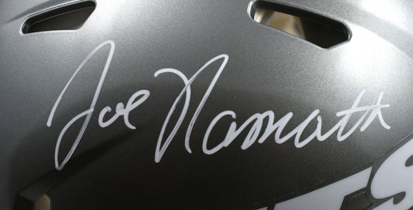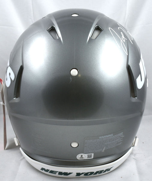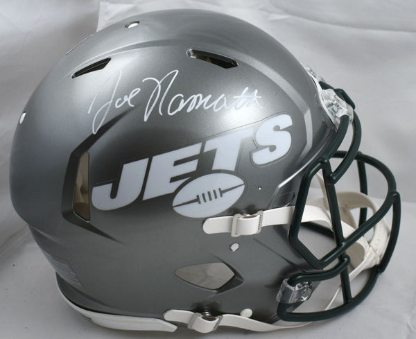 This is a Joe Namath of the New York Jets Autographed Riddell football full size Flash Speed Authentic helmet. This item has a Beckett Witnessed Authentication, which comes with a numbered hologram and a QR code for verification. You can view this item on the Beckett Authentication website and it shows when and where the item was signed. It was signed either at a public autograph appearance or a private signing. This is a stock photo of the item. Although you may not receive this exact item, the item you receive is virtually identical, brand new, and in great shape. This is a Joe Namath of the New York Jets hand autographed Riddell football full size Flash Speed Authentic helmet. This item has a Beckett Witnessed Authentication, which comes with a numbered hologram and a QR code for verification. You can view this item on the Beckett Authentication website and it shows when and where the item was signed. It was signed either at a public autograph appearance or a private signing. This is a stock photo of the item. Although you may not receive this exact item, the item you receive is virtually identical, brand new, and in great shape.