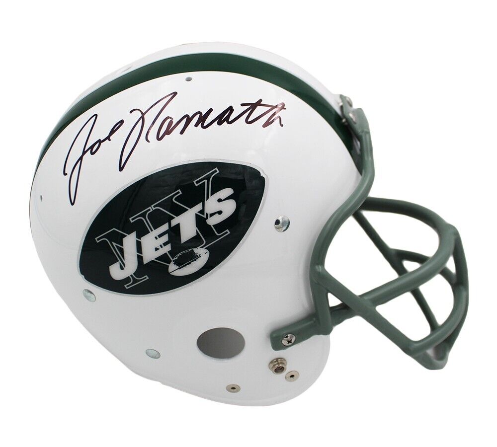 A New York Jets Throwback TK Cow Catcher Mask Authentic White NFL Helmet Hand Signed by Joe Namath. The item and signature are in excellent condition. Joe is a 4x AFL All-Star Selection, 1972 Pro Bowl Selection, Super Bowl III Champion and Most Valuable Player, and Class Of 1985 NFL Hall of Fame Inductee. AUTHENTICATION: The item is accompanied by a Beckett Certificate of Authenticity - Beckett Serial Numbered and Databased Hologram.