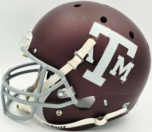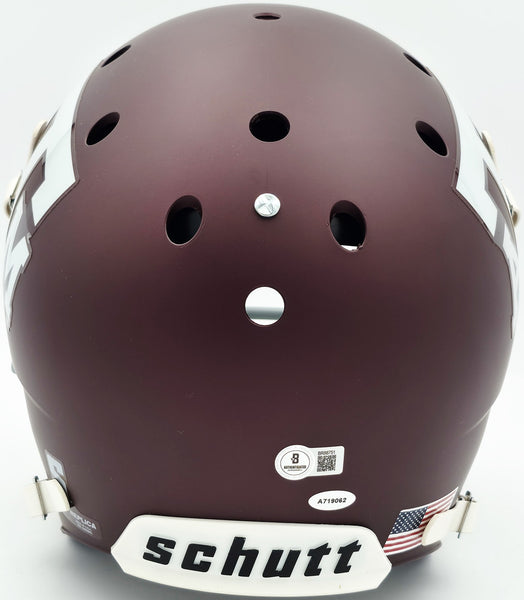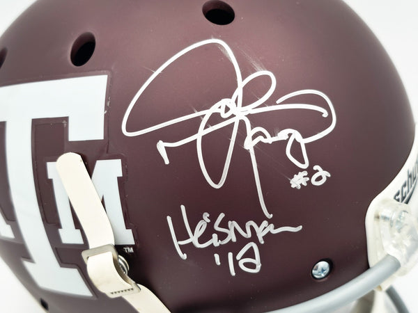 This is a Texas A&M Red Full Size Replica Helmet that has been hand signed by Johnny Manziel. This item was inscribed "Heisman '12." There is a smudge in the signature as shown. This item has been certified authentic by Beckett Authentication (BAS) and comes with their tamper-proof QR Code hologram.