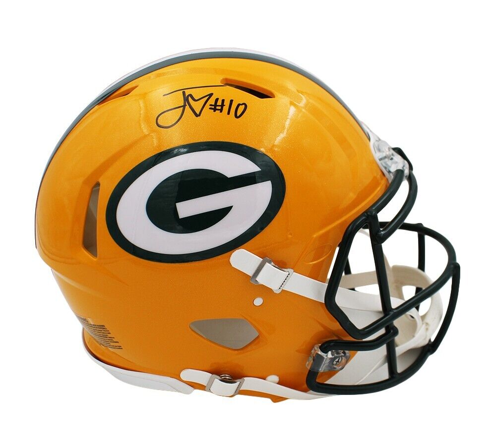 A Green Bay Packers Speed Authentic NFL Helmet hand signed by Jordan Love. The item and signature are in excellent condition. Jordan is a football quarterback for the Green Bay Packers drafted in the 2020 NFL Draft. AUTHENTICATION: The item is accompanied by a Beckett Serial Numbered and Databased Hologram.
