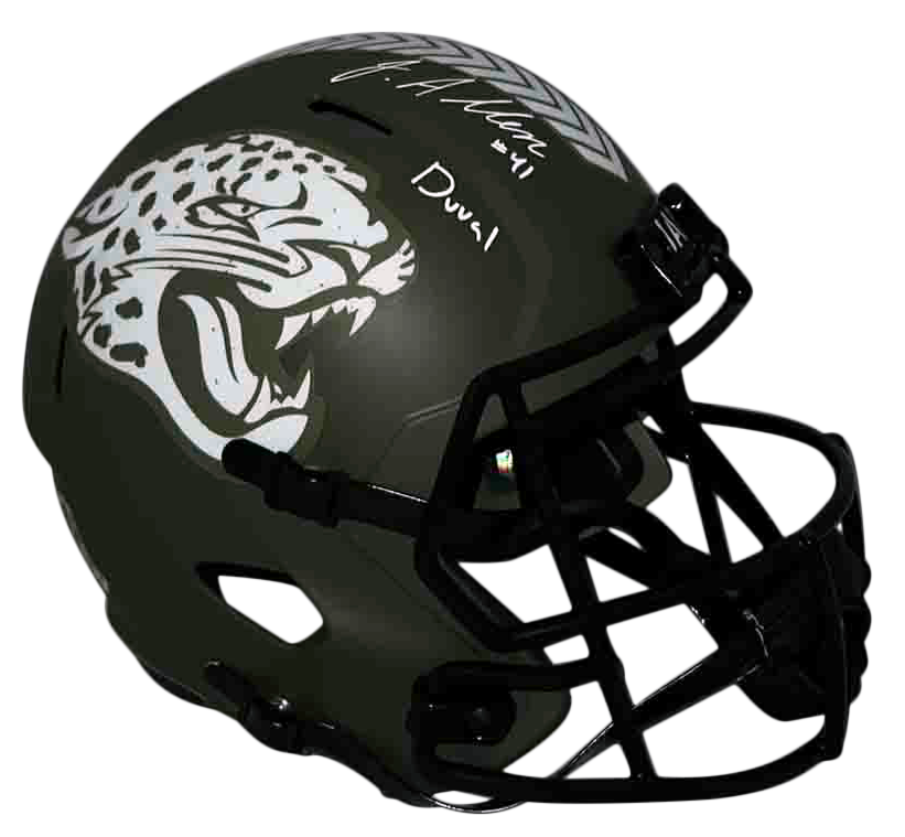 Josh Allen, star linebacker for the Jacksonville Jaguars, has hand signed this Jaguars Riddell Speed Salute to Service full-size replica helmet at a private signing. He included the inscription "Duval" with his signature. This item comes with a certificate of authenticity (COA) from JSA - James Spence Authentication and was signed in the presence of one of their representatives. You will receive a serial-numbered COA along with a matching serial-numbered sticker on the helmet. The authenticity can be verified online by entering the serial number.Item pictured may not be the exact item you will receive. It will be similar quality, and we guarantee your satisfaction.