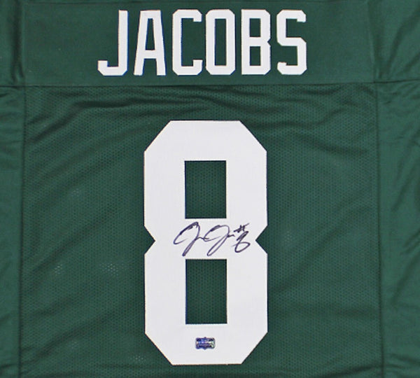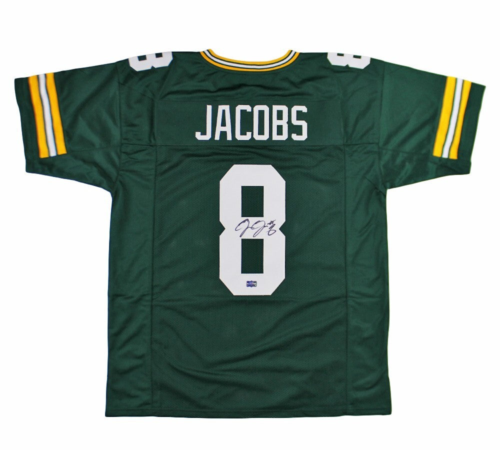 A Green Bay Custom Green Jersey hand signed by Josh Jacobs. The item and signature are in excellent condition. Josh was selected in the NFL draft in 2019 by the Oakland Raiders. He attended college at Alabama. He is currently playing for the Green Bay Packers. He is an NFL Rushing Yard leader and a 2x Pro Bowler. AUTHENTICATION: Your item has been tagged with a SmarTag Powered by Prova Technology, which gives you digital access to your items authentication records, including a proof picture from the signing.