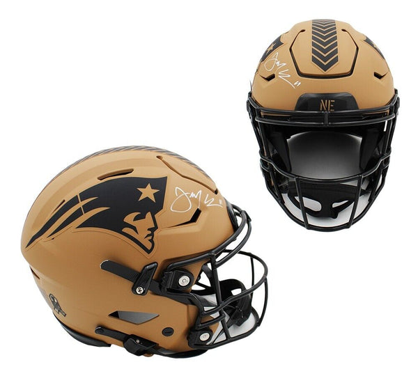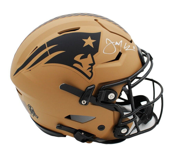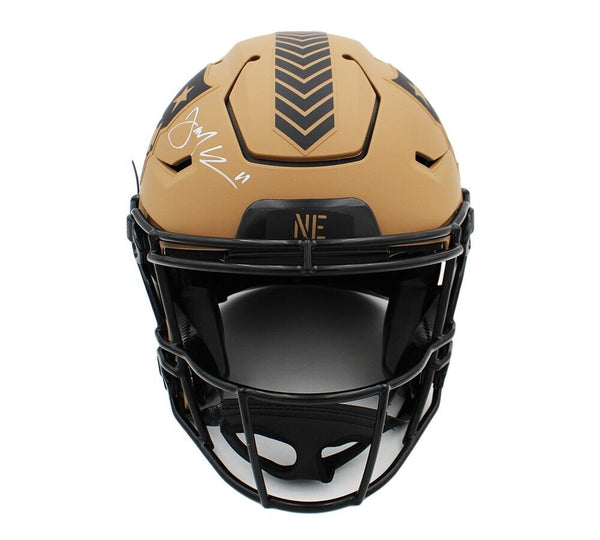 A New England Patriots Speed Authentic Salute to Service 2 NFL Helmet Hand Signed by Julian Edelman. The item and signature are in excellent condition. Julian is a wide receiver and punt returner for the New England Patriots. He played college football at Kent State and the College of San Mateo as a quarterback. He was drafted by the Patriots in the seventh round of the 2009 NFL Draft. AUTHENTICATION: The item is accompanied by a JSA Certificate of Authenticity - JSA Serial Numbered and Databased Hologram